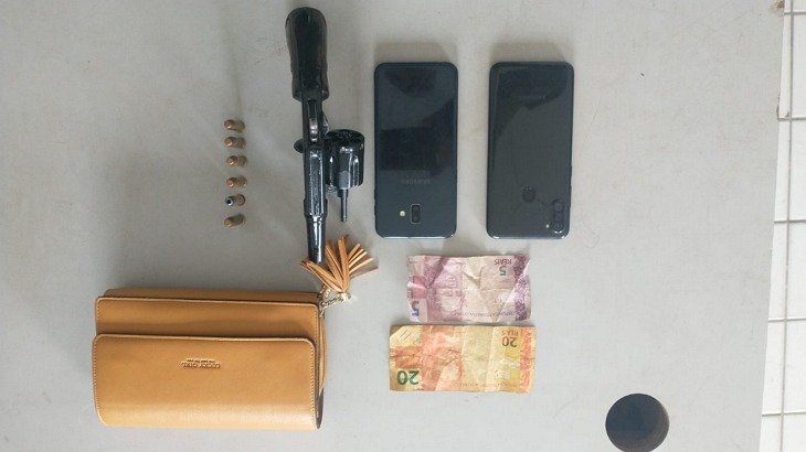Quando os bandidos viram os policiais tentaram fugir, foram alcançados e presos, com eles foi encontrado um revólver calibre 38, com munições, os celulares e uma bolsa das vítimas.