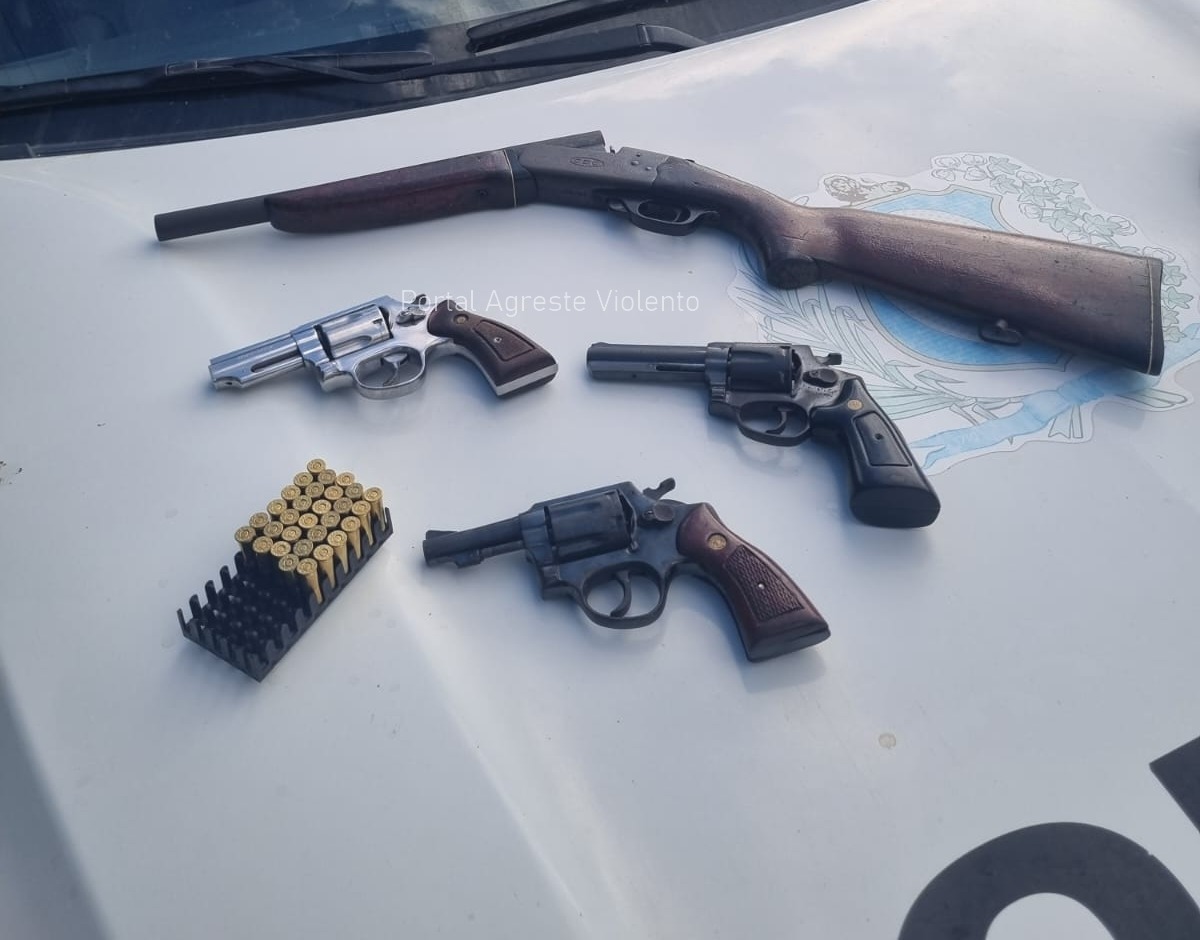 Os policiais abordaram o carro que ele estava e encontraram munições e um revólver calibre 38, o homem que tem 23 anos informou que gostar de armas e que em sua casa no Sítio Pau Ferro existiam outras.