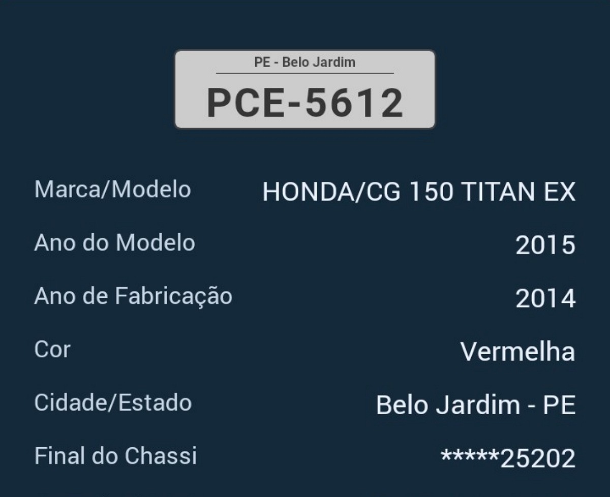 Na noite de segunda-feira, 15, foi furtada uma motocicleta que estava estacionada na frente de uma residência no bairro Bom Conselho, em Belo Jardim/PE. O veículo tem placa PCE-5612, cor vermelha e modelo CG 150 Titan.