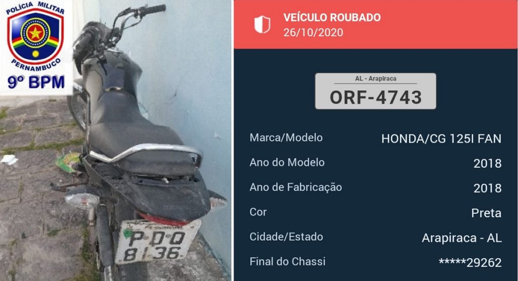 O efetivo da Rocam realizava patrulhamento quando visualizou a moto modelo CG 125 Fan na frente de uma residência, com placa da cidade de Ouricuri. Diante da suspeita de ser clonada, foi procedida uma consulta mais detalhada e verificou-se claros indícios de remarcação na numeração do chassi, que ao consultar os intactos, foi possível identificar a moto como sendo de placa original ORF-4743 com restrição roubo/furto no município de Arapiraca/AL.