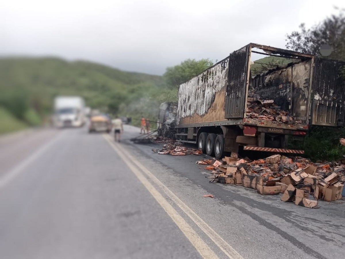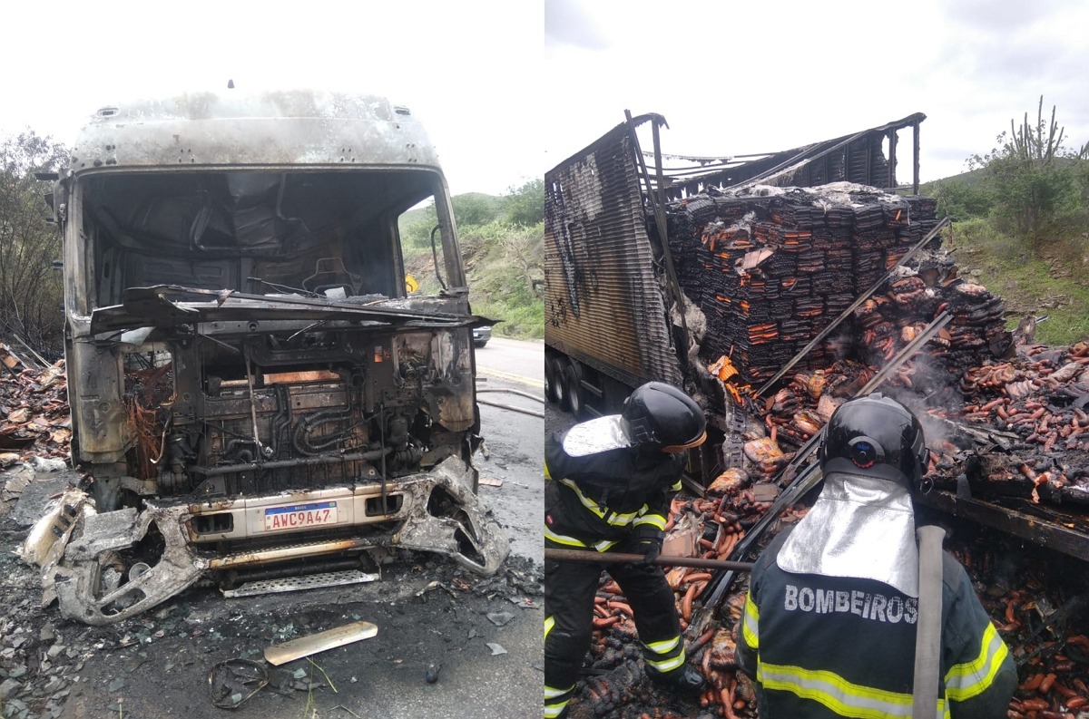 Uma carreta carregada com salsichas pegou fogo e ficou totalmente destruída, no fim da manhã desta segunda-feira (26), no Km 131,7, na BR-423, na Serra dos Ventos, no município de Saloá, no Agreste.