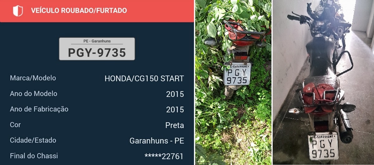 A Polícia Militar apreendeu uma motocicleta CG 150 Start de placa PGY-9735 na manhã de quinta-feira, 22, numa estrada do Sítio Cumunaty, acesso ao Distrito de Curral Novo, em Águas Belas. Ela estava escondida no mato e havia sido roubada em Garanhuns no dia 15 de maio num loteamento próximo a Cohab I. O veículo pertence a um mototaxista por aplicativo.