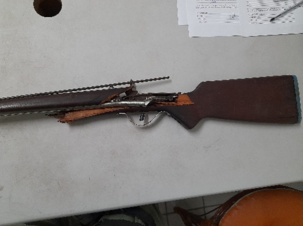 A vítima informou a Polícia Militar que o agressor usou para agredi-la uma barra de ferro, que foi em casa buscar uma espingarda e que a arma explodiu no momento que ele disparou.