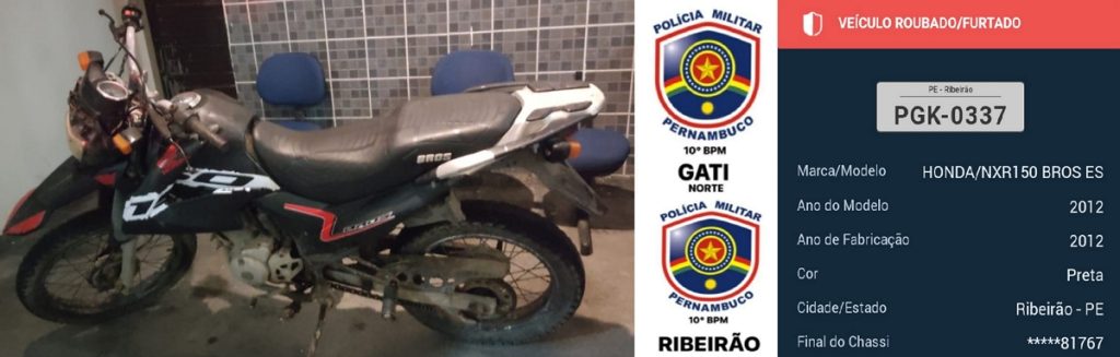 Policiais militares do 10º BPM apreenderam uma motocicleta que estava com queixa de roubo. O Veículo modelo NXR 150 Bros na cor preta com placa PGK-0337 estava estacionado na Rua João Manoel, na Vila Rica, em Ribeirão, na noite de domingo, 11.