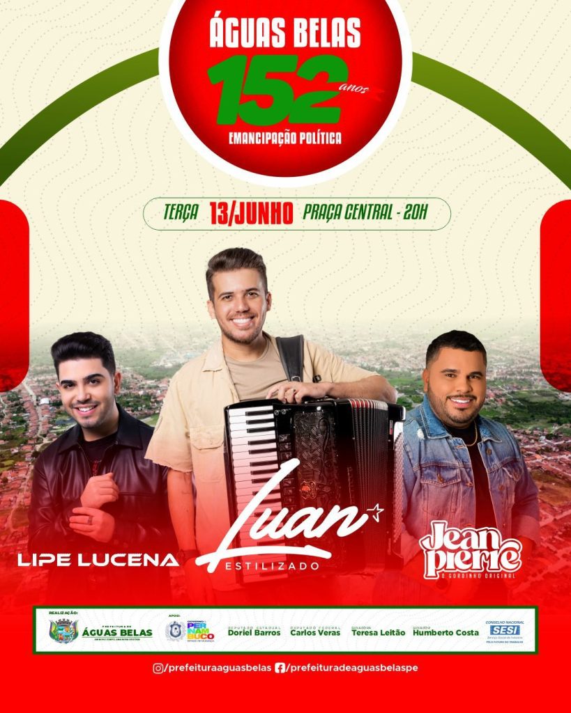 A Prefeitura de Águas Belas, no Agreste pernambucano, anunciou, nesta segunda-feira (5), as atrações para a festa de 152 anos de emancipação política do município, no próximo dia 13 de junho, a partir das 20h, na praça central.