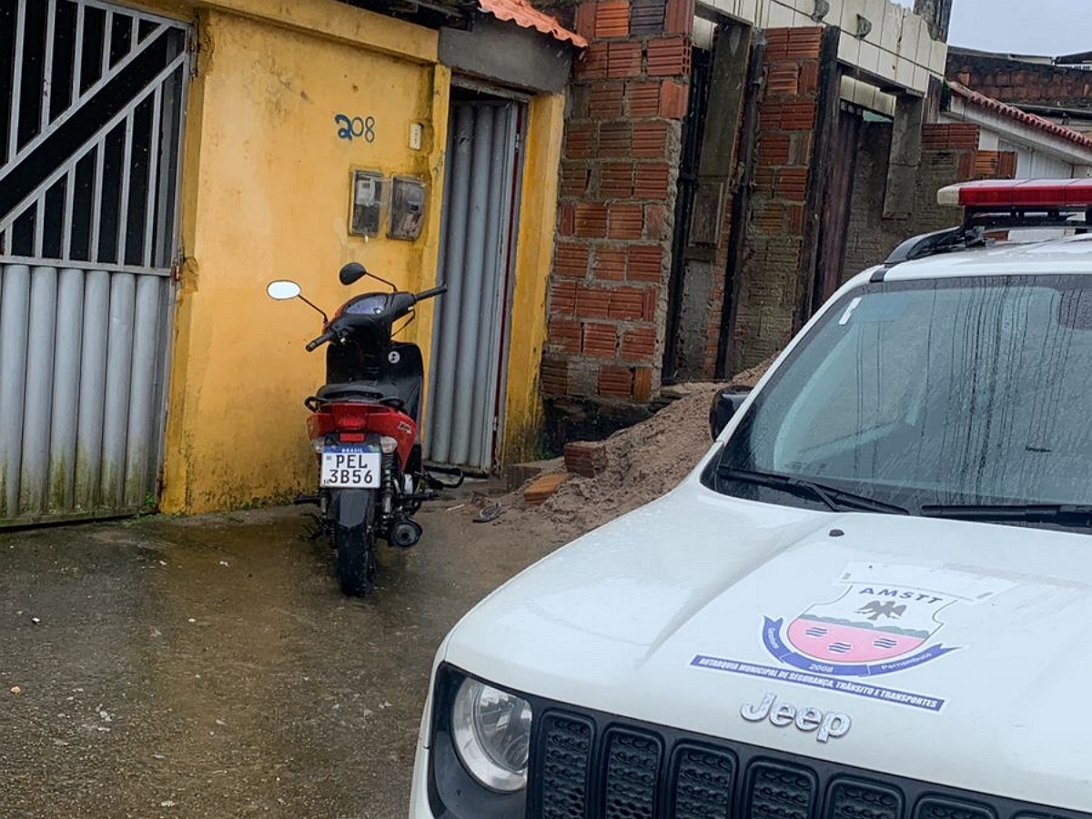 Os guardas foram verificar uma denúncia de uma moto que estava abandonada em frente a garagem de uma residência, ao chegarem no local realizaram a consulta da moto Honda Biz, 125, cor vermelha, placa PEL-3B56, que constou como roubada.