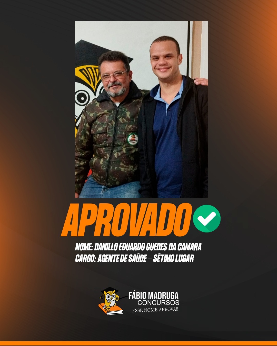 O Professor Fábio Madruga comemorou a aprovação de mais um aluno em concurso público. Dessa vez foi Danilo Eduardo Guedes, ele foi aprovado ficando em 7º lugar, para o cargo de Agente Comunitário de Saúde, no concurso da Prefeitura de Jupi.