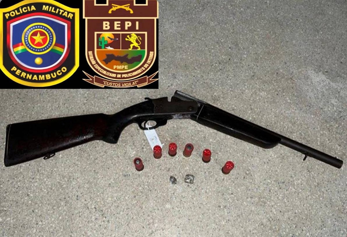 Uma equipe do BEPI durante a Operação Combate ao CVLI, quando em rondas, abordou o suspeito de 26 anos e com o mesmo foi encontrada 01 espingarda calibre 12, com 06 munições calibre 12 intactas e 02 big bigs de maconha.