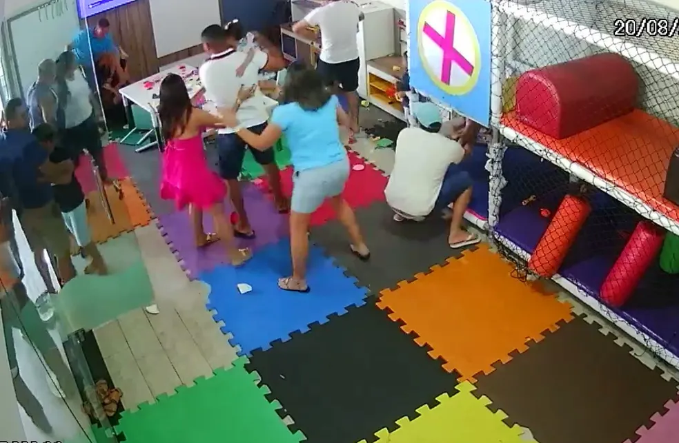 Ao ver a confusão, o marido entrou no local, de acordo com o boletim, gritando e xingando a vítima. Quando a cuidadora caiu, foi agredida com chutes no rosto e puxões de cabelo. O homem ainda puxou uma arma de fogo e ficou segurando. Durante a briga, os outros pais correm para tirar as crianças de dentro do parquinho.