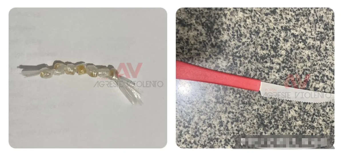 Os policiais realizavam rondas quando perceberam que uma mulher ao visualizar a viatura jogou algo no chão. Ao realizar a varredura no local, foi encontrado um saquinho com 07 pedras de crack, e na busca pessoal foi encontrado uma faca com ela.