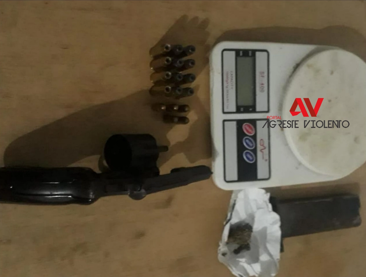 Um revólver calibre 38, munições calibres 38 e 32, uma balança de precisão e maconha, foram apreendidos na casa de um homem suspeito de traficar drogas, no município de São Bento do Una, no Agreste de Pernambuco.