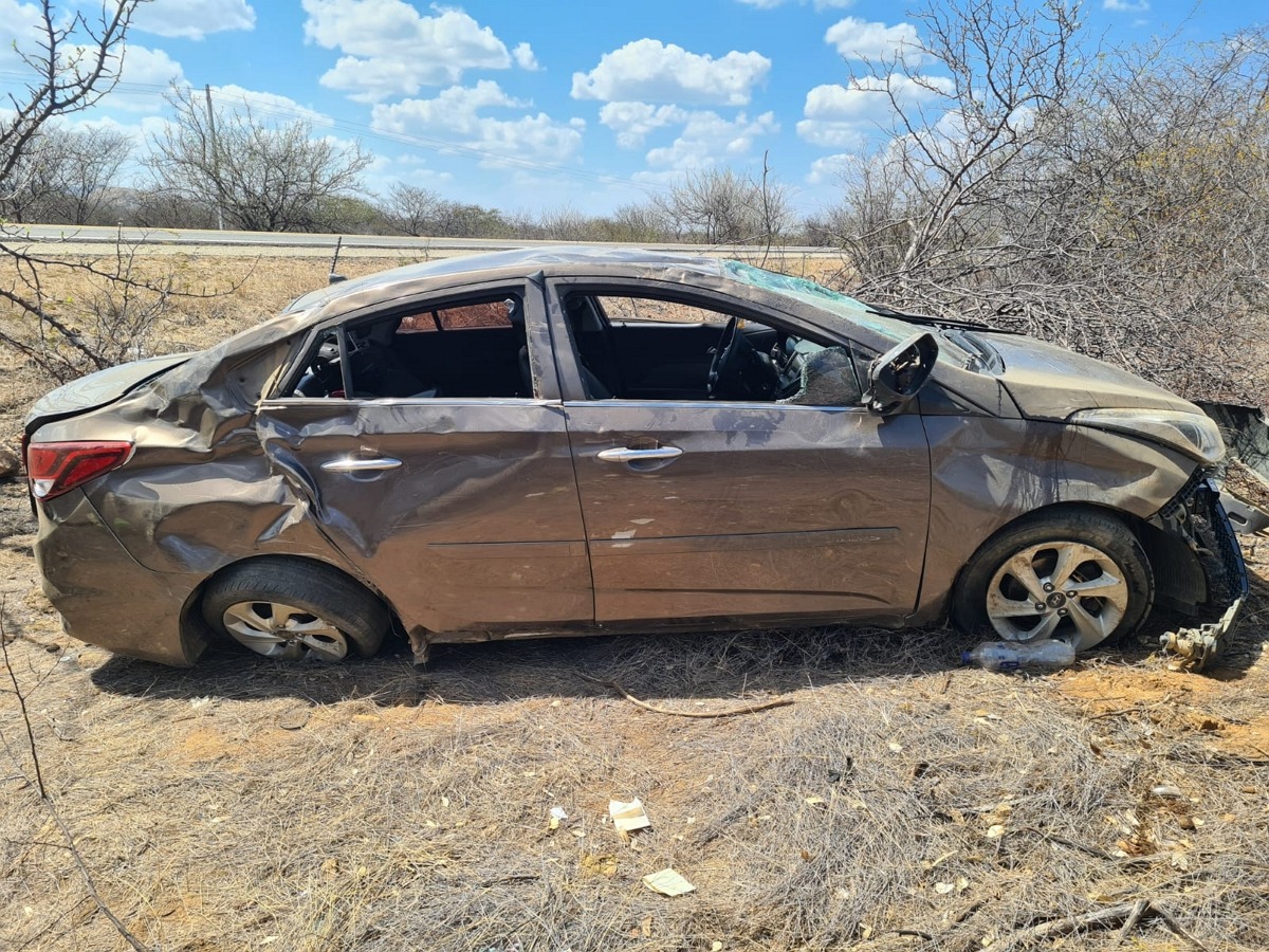 De acordo com a Polícia Rodoviária Federal (PRF), um veículo de passeio (HB20) saiu de pista e capotou. A suspeita é que o motorista de 38 anos, que se feriu levemente, tenha perdido o controle da direção em razão de um derramamento de brita sob a pista de rolamento. Ele foi submetido ao teste do etilômetro e o resultado foi negativo para o consumo de álcool.
