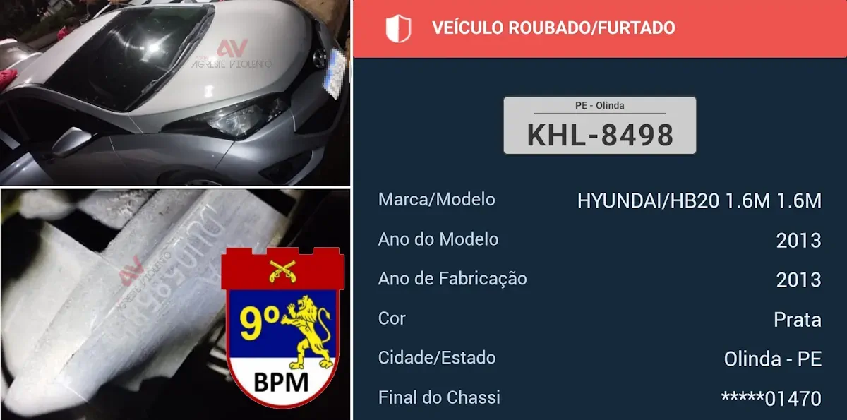 Policiais da ROCAM (Ronda Ostensiva Com Apoio de Motocicleta) apreenderam um veículo modelo HB20, de cor prata, com placa KHL-8498, que havia sido roubado no mês de março em Boa Viagem, Recife. A apreensão ocorreu por volta das 18h de sábado, 2, no Distrito de Frexeiras, em São João/PE, após denúncia de perturbação de sossego.
