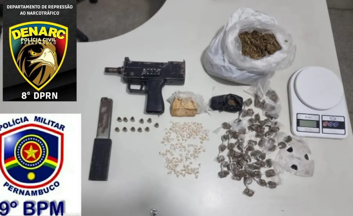 Policiais civis da 8ª Denarc (Delegacia de Repressão ao Narcotráfico) em conjunto com militares do 9º BPM (Batalhão de Polícia Militar) prenderam três indivíduos envolvidos em uma facção criminosa de nível nacional dedicada ao tráfico de drogas e homicídios, na noite de terça-feira, 5, no bairro Manoel Chéu, em Garanhuns/PE. Com os presos, foi encontrada uma submetralhadora calibre 9mm municiada, além de maconha, pedras de crack e uma balança de precisão.