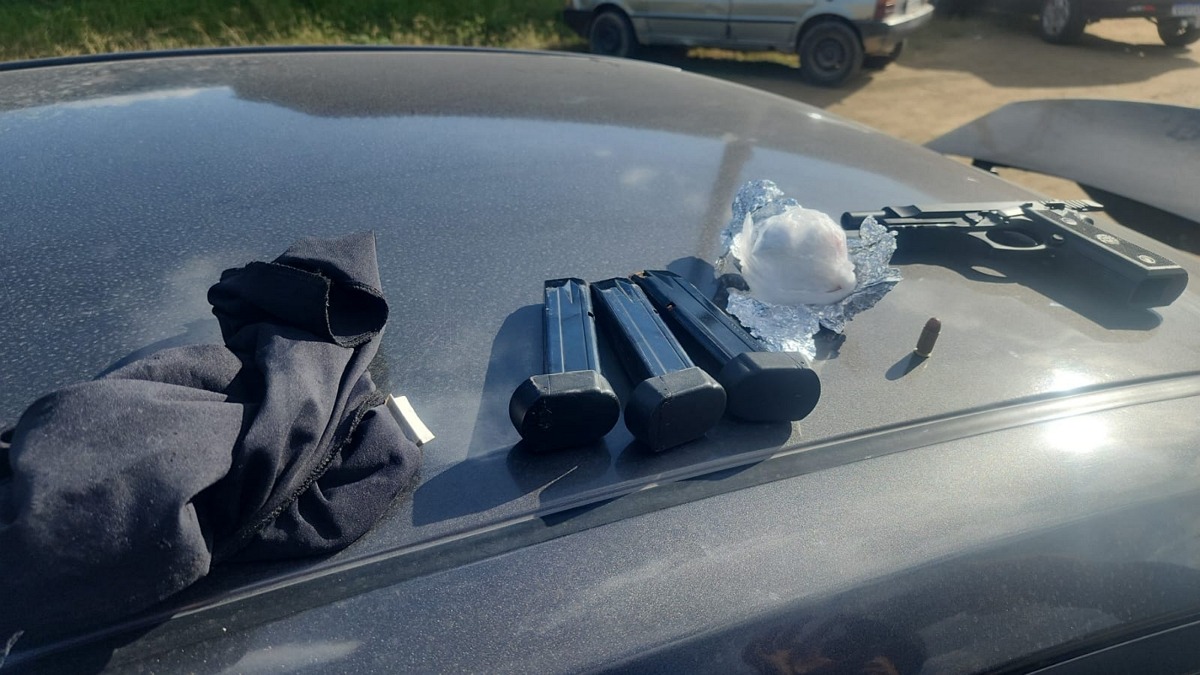 Os policiais realizaram uma verificação detalhada no carro e encontraram a pistola coberta por uma touca balaclava, além de um saco plástico com porções de cocaína. O material estava escondido em um fundo falso localizado no painel do veículo.