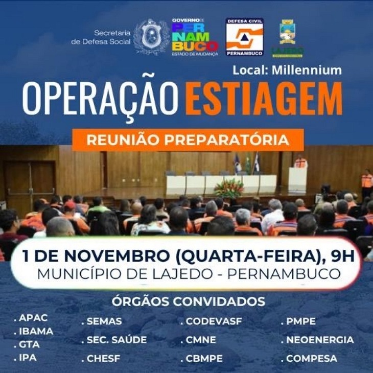 A cidade de Lajedo, localizada no Agreste do Estado, recebe a reunião preparatória da Operação Estiagem, organizada pela Defesa Civil do Estado.