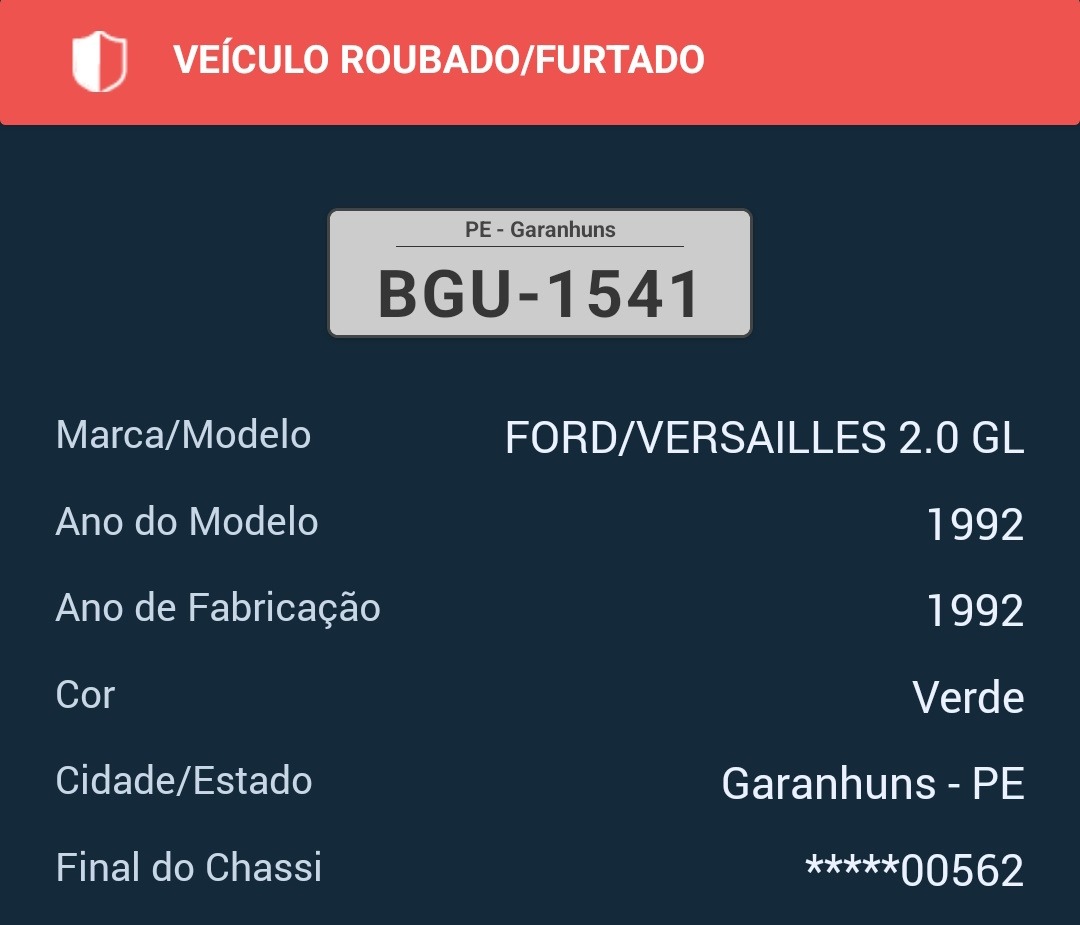 A polícia civil está investigando o furto de um veículo modelo Versailles na cor verde com placa BGU-1541. O caso ocorreu durante a tarde de quarta-feira, 29, no Sítio Pau Ferro em Garanhuns.
