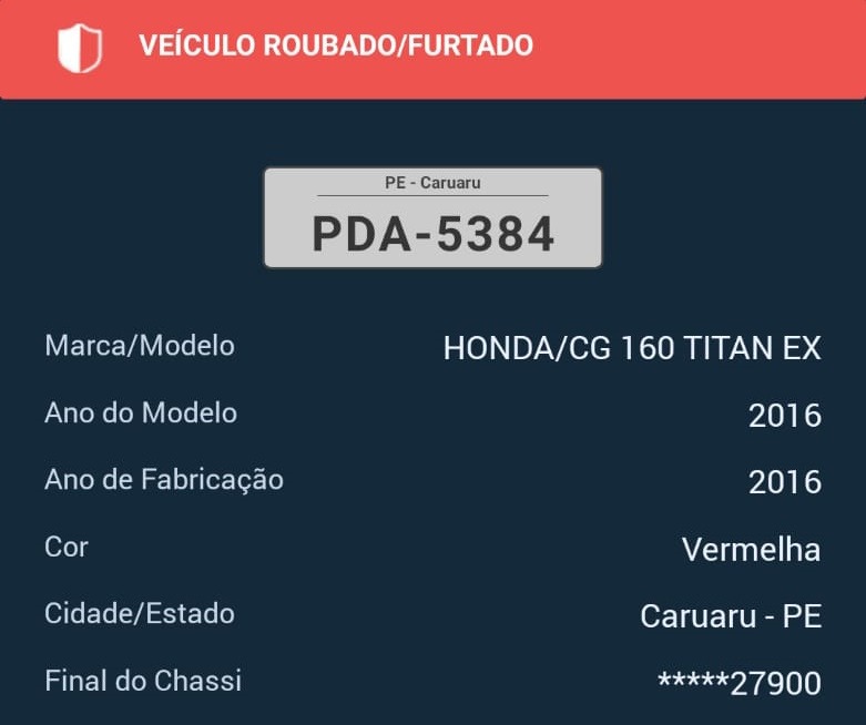 Militares do 10º BPM apreenderam uma motocicleta CG 160 Titan EX, de cor vermelha, com placa PDA-5384, que estava registrada como roubada. A apreensão ocorreu durante à tarde de segunda-feira, 8, na Rua do Campo, no bairro Novo, em Xexéu/PE. O suposto proprietário, um indivíduo de 29 anos, foi conduzido à delegacia.