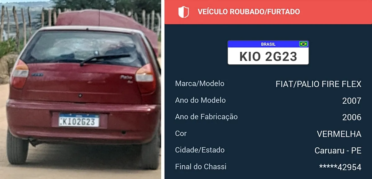 A polícia militar apreendeu um veículo modelo Palio Fire de cor vermelha, com placa KIO-2G23, na tarde de sexta-feira, 23, no Sítio Mochila, na zona rural do município de Garanhuns/PE. O veículo estava com queixa de roubo na cidade de Caruaru.
