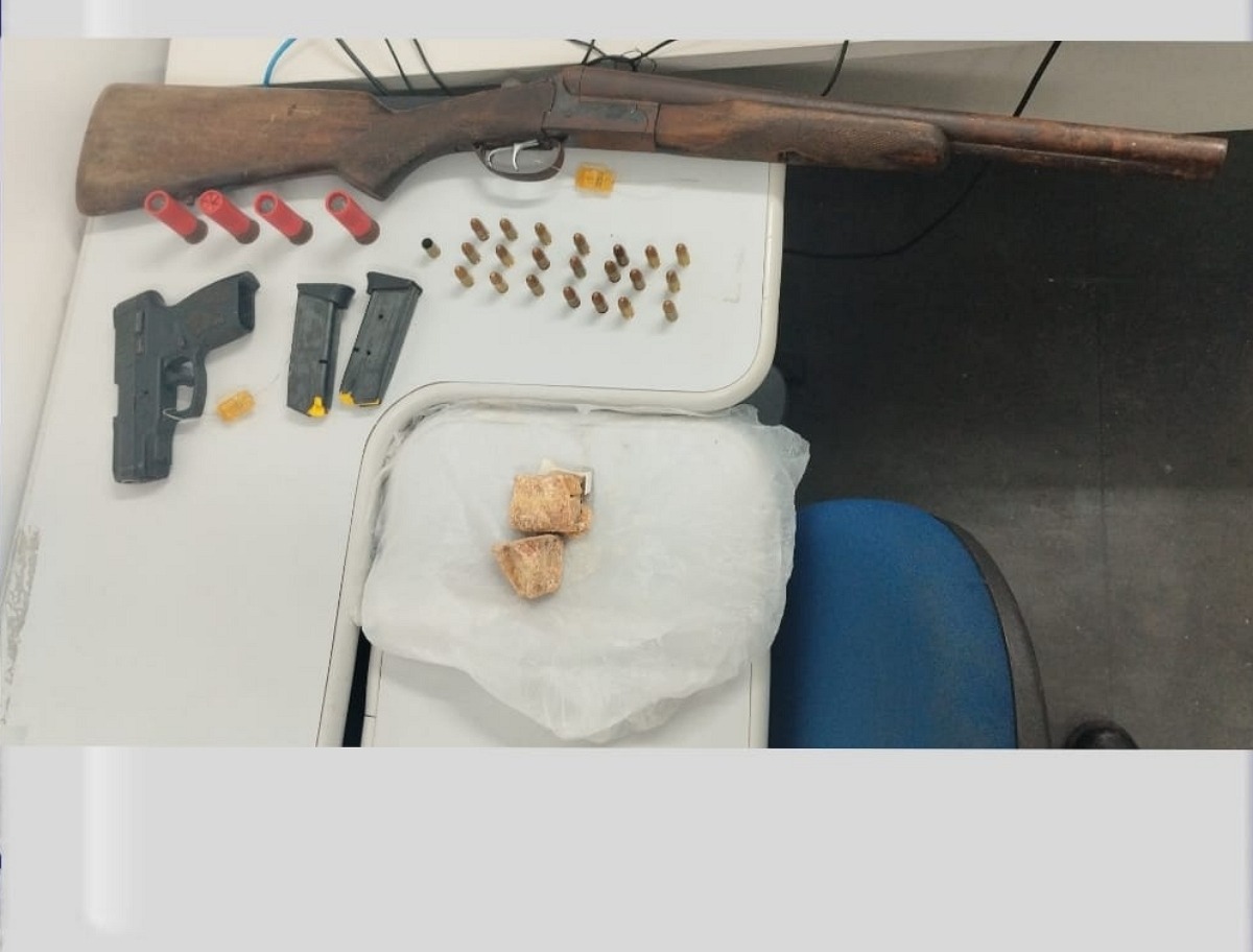 Durante a revista no local, foram encontradas uma espingarda calibre doze, uma quantidade de crack, além de dois carregadores de pistola, vinte e uma munições calibre 9mm e quatro munições calibre 12.