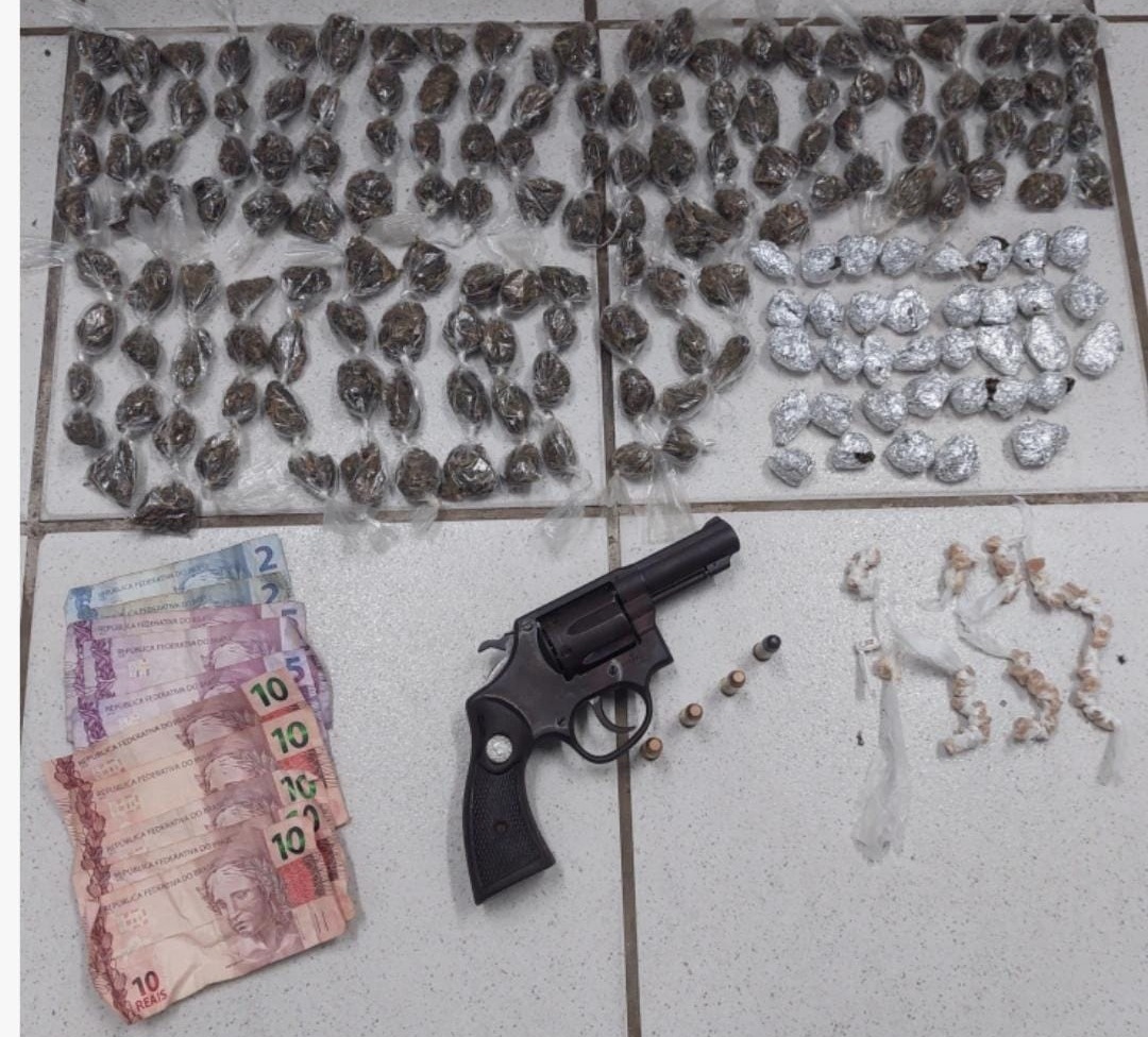 Ao notar que seria abordado, ele empreendeu fuga entrando por um terreno, mas foi cercado. Na busca pessoal, foram encontrados um revólver calibre .38 com quatro munições pinadas e, em sua mochila, 174 big bigs de maconha, 47 pedras de crack e R$ 69,00.