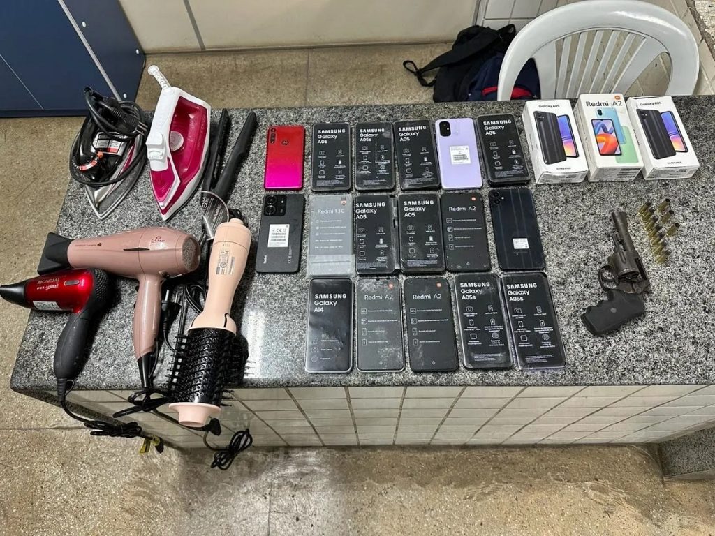 O suspeito tinha um mandado de prisão em aberto pela prática de roubo, expedido pela Vara das Execuções Criminais da Comarca de Contagem-MG. Foram recuperados e apreendidos um revólver calibre 38, cinco munições intactas, duas pinadas e três deflagradas, uma motocicleta, vinte aparelhos celulares e vários eletrodomésticos.