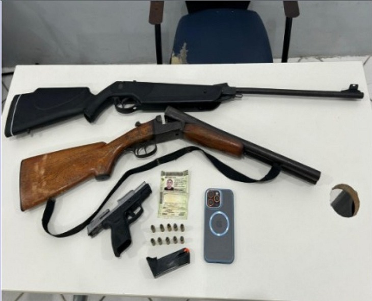 O envolvido revelou ainda ter armas guardadas em uma residência no bairro Malhada do Meio, onde os policiais localizaram uma pistola calibre .40 com dez munições, uma espingarda calibre 12 e uma espingarda de chumbinho.