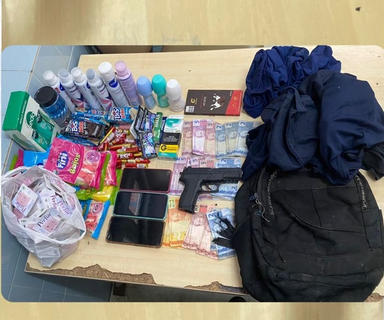 Com o trio foram encontrados um simulacro de arma de fogo, três celulares, diversos produtos da farmácia e a quantia de R$ 134,00.