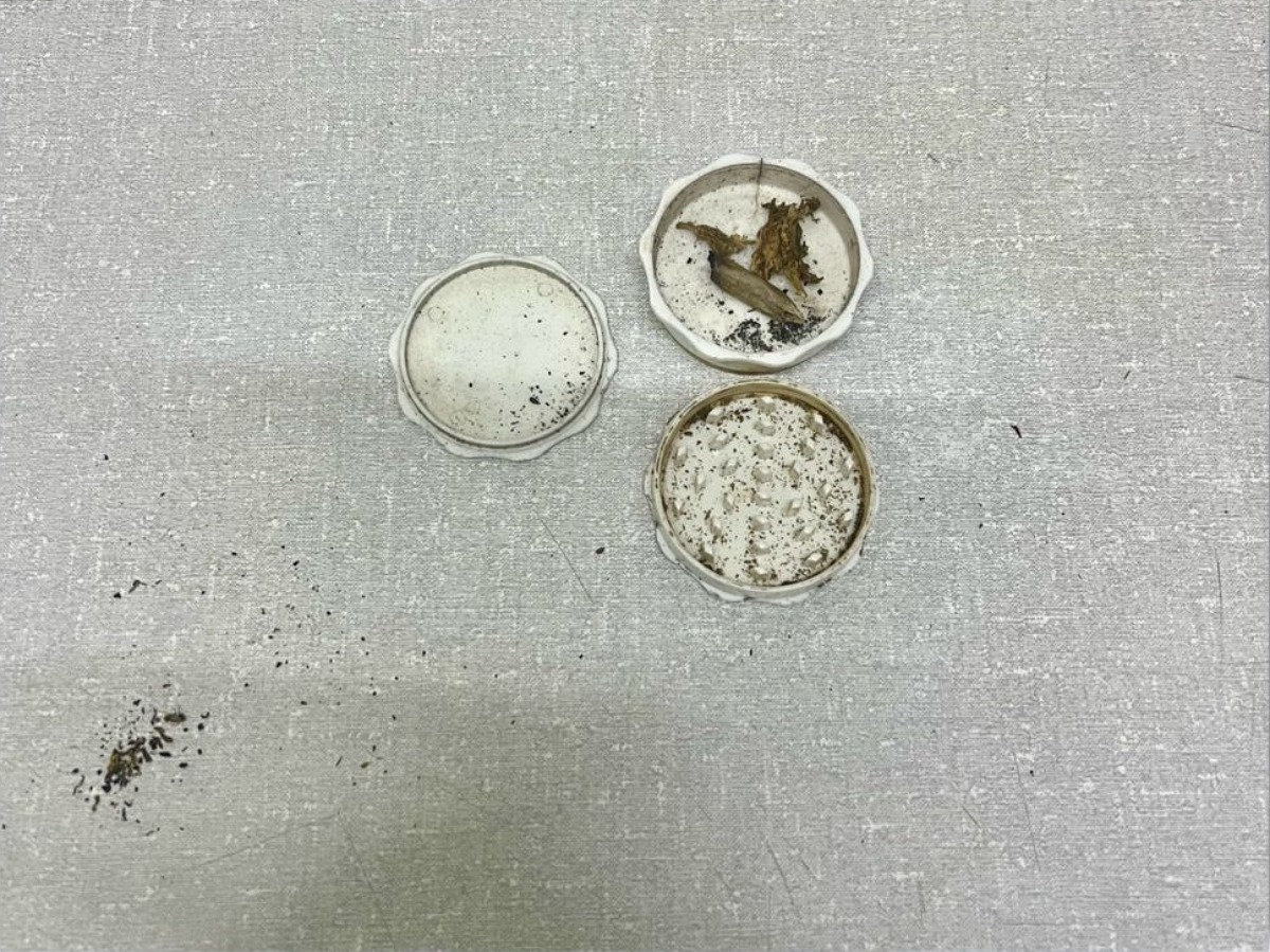 Durante a revista pessoal, foi encontrado com o passageiro um dichavador de ervas com vestígios de maconha, além de um compartimento contendo duas porções da mesma substância, uma delas em estado natural e a outra enrolada em metade de um cigarro.