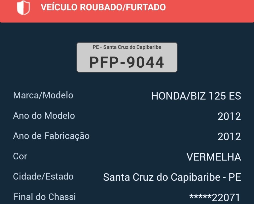 As vítimas trafegavam em uma moto Honda Biz, cor vermelha, placa PFP-9044, quando foram abordadas por dois elementos que estavam armados, além da moto eles levaram celulares e carteira com cartões, documentos e dinheiro.