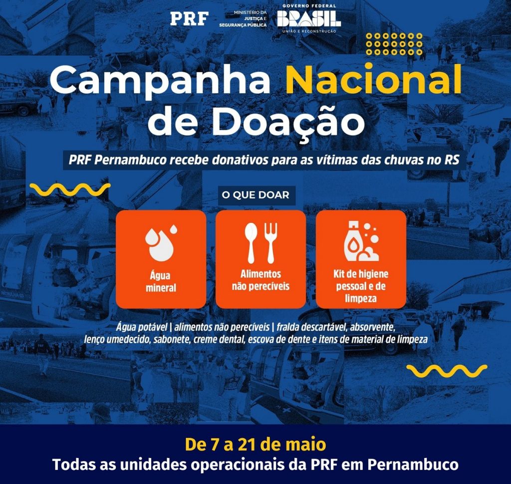 A Polícia Rodoviária Federal (PRF) em Pernambuco iniciou, na terça (07), uma campanha de arrecadação de donativos para as vítimas das enchentes no Rio Grande do Sul (RS). Até o próximo dia 21 de maio, todas as unidades da PRF no estado estarão recebendo as doações.