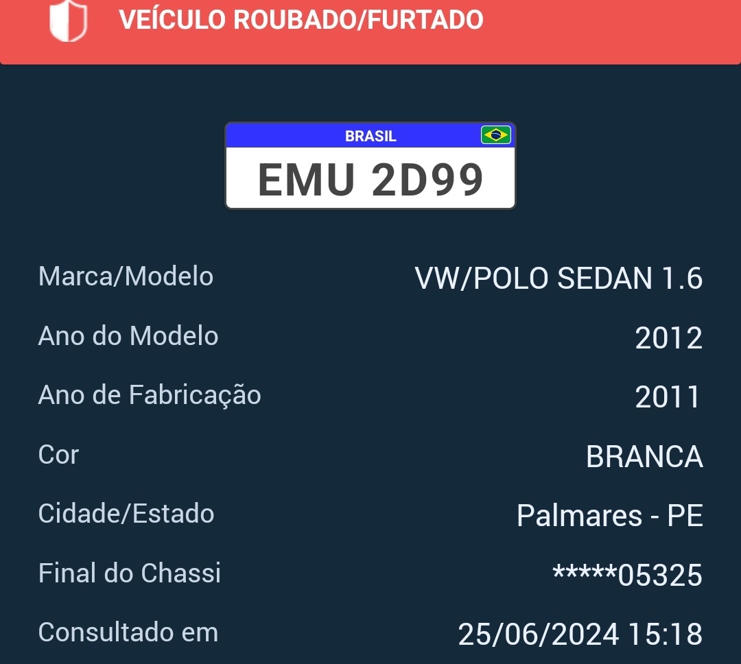 Um Polo Sedan, cor branca, placa EMU-2D99, foi tomado de assalto na noite desta segunda-feira (24), na BR-423, nas imediações do Posto 13, no município de Garanhuns.