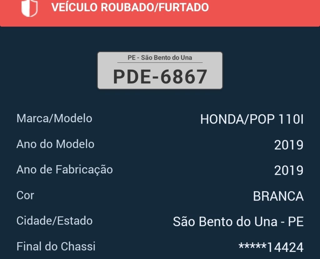 A vítima informou que estava indo pra casa, além da moto Honda Pop 110I, cor branca, placa PDE-6867, levaram um aparelho celular.