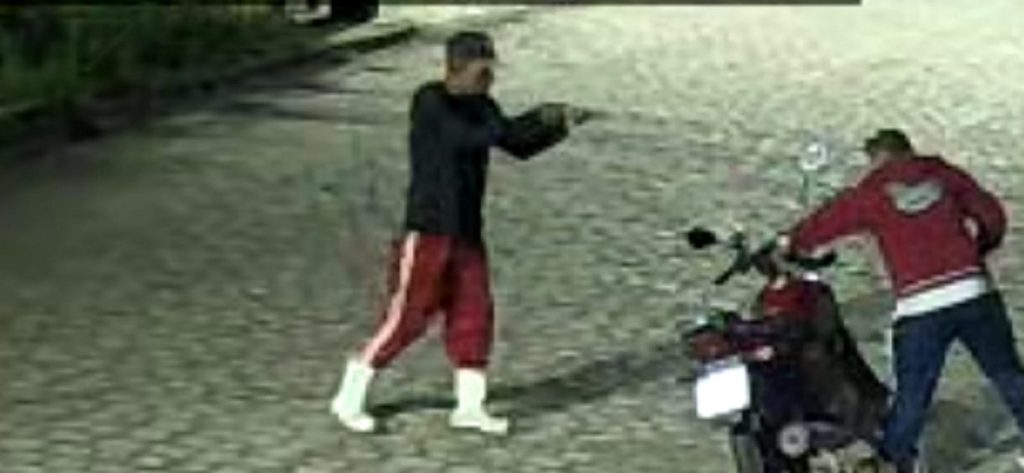 As imagens mostram o momento da ação. É possível observar quando o criminoso não identificado, usando uma calça vermelha, botas e um casaco preto chega e anuncia o assalto. Ele está com uma arma em punho.