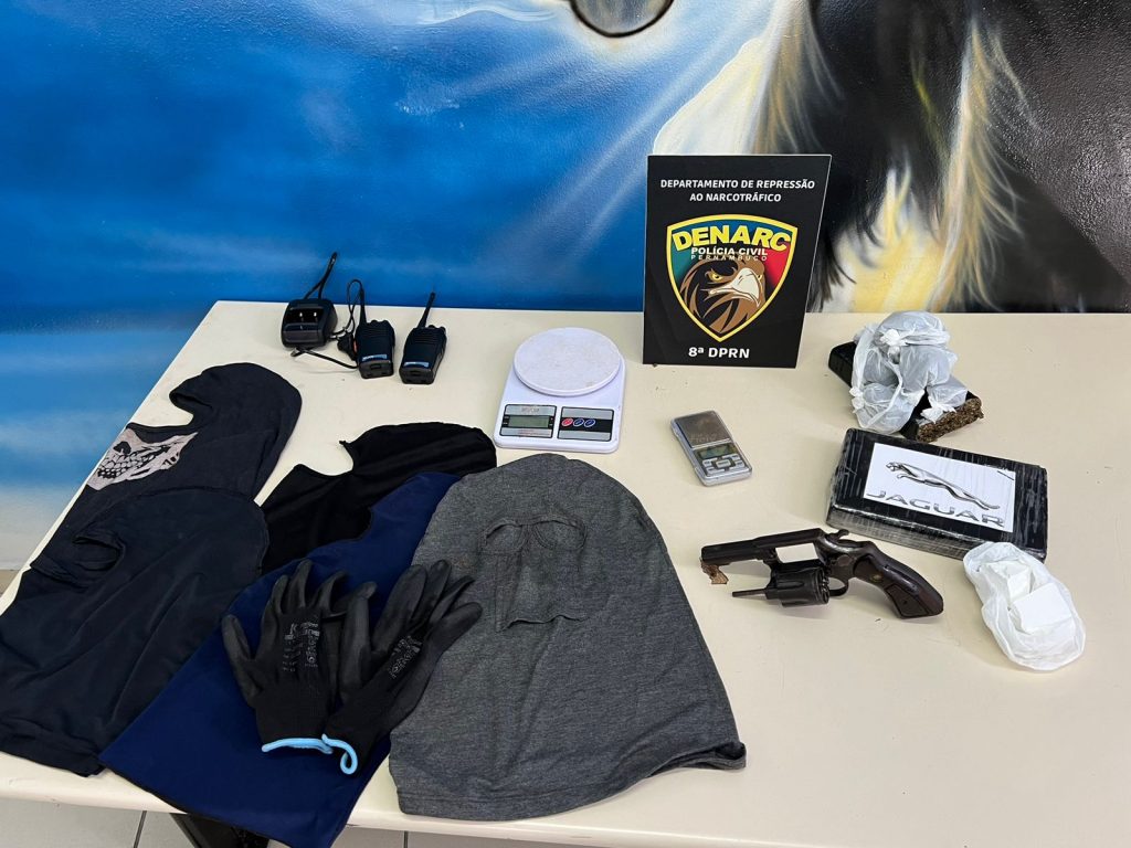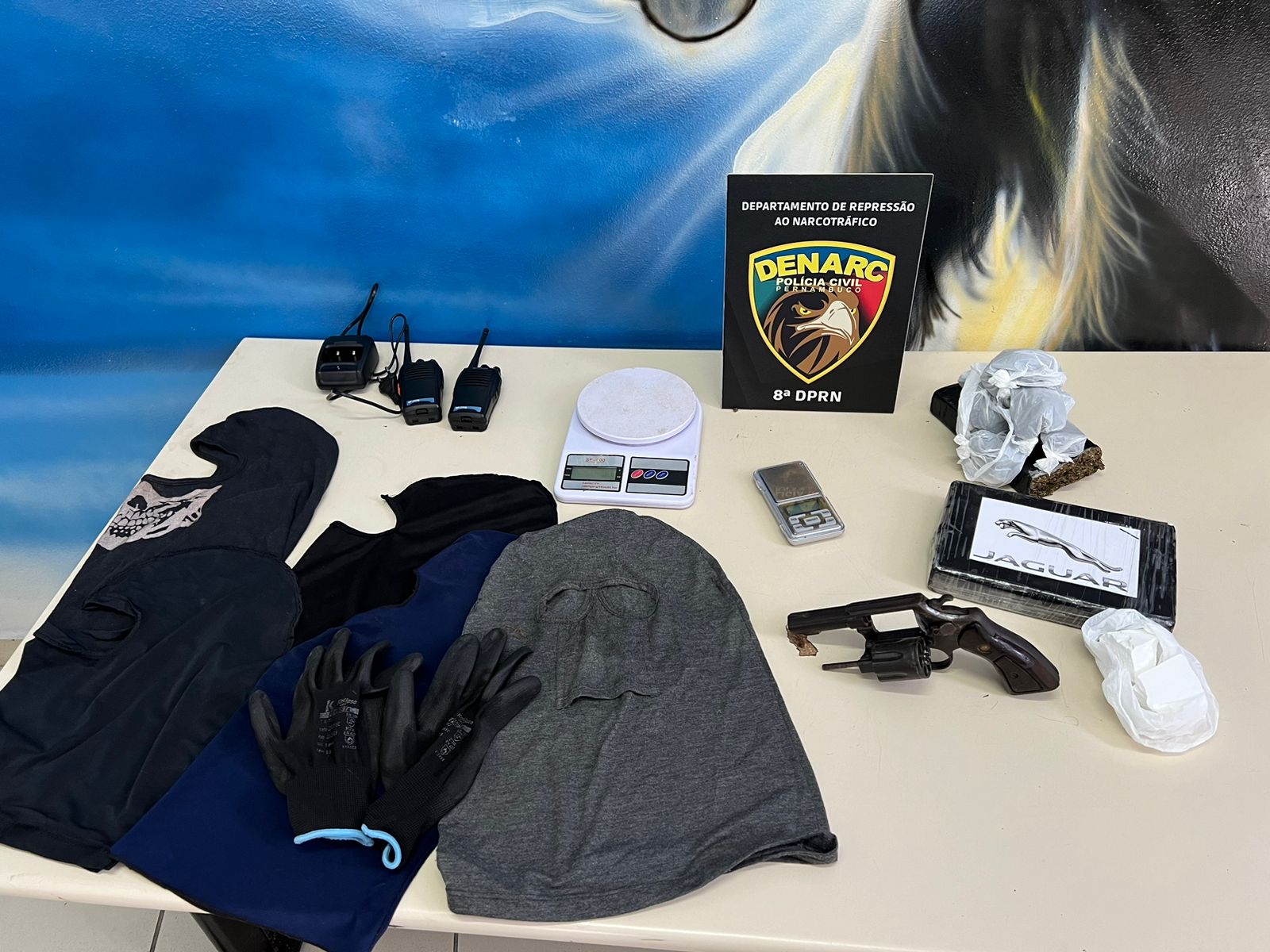 Durante a operação, a polícia apreendeu uma quantidade de entorpecentes e materiais relacionados ao tráfico. Foram encontrados 1.137 gramas de cocaína e 745 gramas de maconha, além de um revólver calibre 38, duas balanças de precisão, dois rádios comunicadores, cinco balaclavas e um par de luvas.
