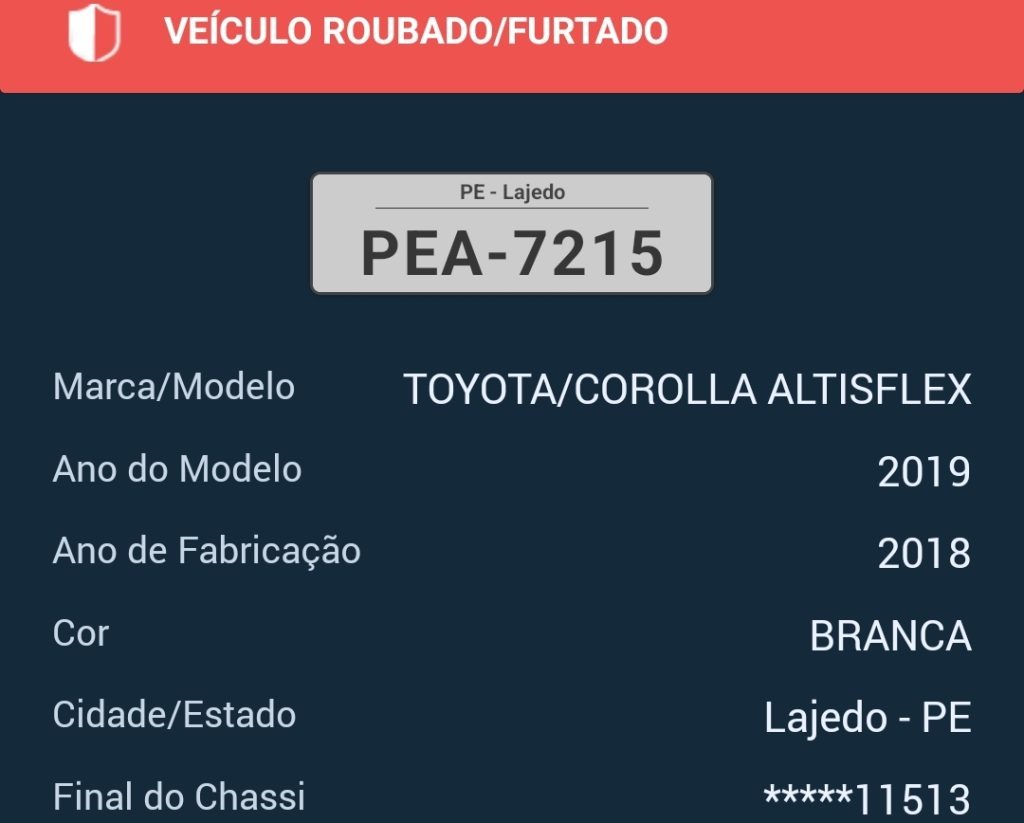 Os criminosos renderam mãe e filho que estavam na residência, obrigaram as vítimas a deitarem no chão e fugiram levando dois celulares, um aparelho de TV, três ventiladores, uma bombox, e o veículo Toyota Corolla, cor branca, placa PEA-7215.
