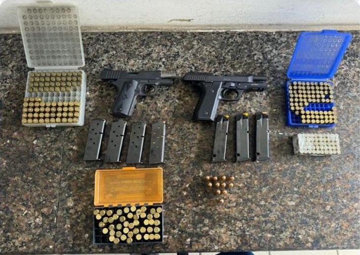 O suspeito revelou ter outra arma, que estaria em sua casa, mas ao dar continuidade à busca veicular foram encontrados uma pistola .45 e um carregador com seis munições. O efetivo localizou, ainda dentro do carro, mais 107 munições .9mm e 145 estojos.