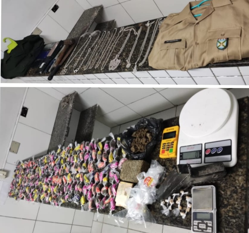 Na casa ainda havia vários materiais usados para o tráfico de drogas e no total foram recolhidos 239 big bigs e outras 315g de maconha, 14 pedras de crack, uma balaclava, três armas brancas, balanças de precisão, cinco celulares e R$ 120,00 em espécie.