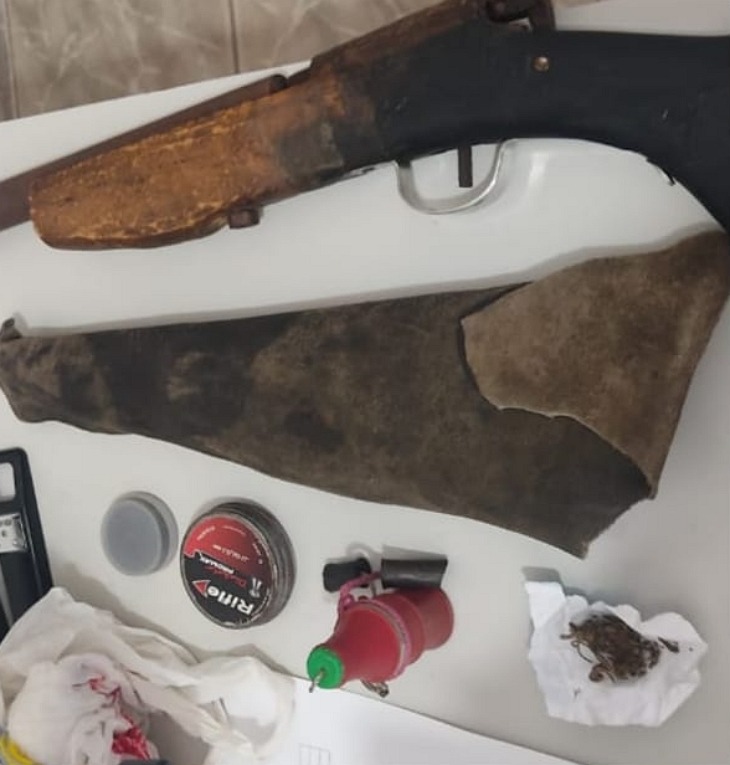 De acordo com a polícia, ao chegar à residência do acusado, ele foi localizado saindo de seu quintal. Questionado sobre os disparos, o homem negou a acusação. Contudo, durante buscas na área, os policiais encontraram, sob a árvore, uma sacola plástica contendo uma arma artesanal do tipo garrucha, além de materiais para recarga, como chumbo, pólvora e espoletas.