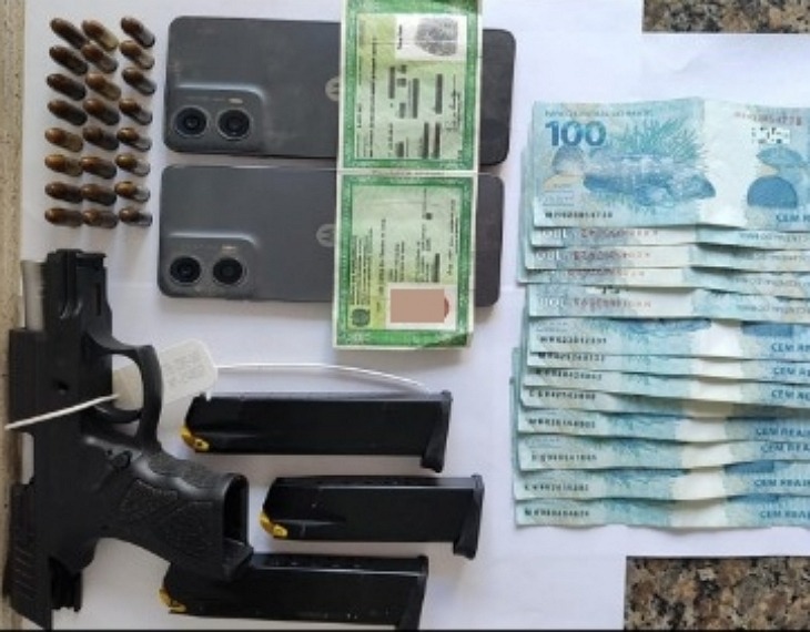 Na abordagem, foram apreendidos um documento falso, que ele tentou apresentou à equipe; uma pistola calibre 9mm; 3 carregadores; 24 munições; dois celulares e a quantia de R$ 1300,00 em espécie.