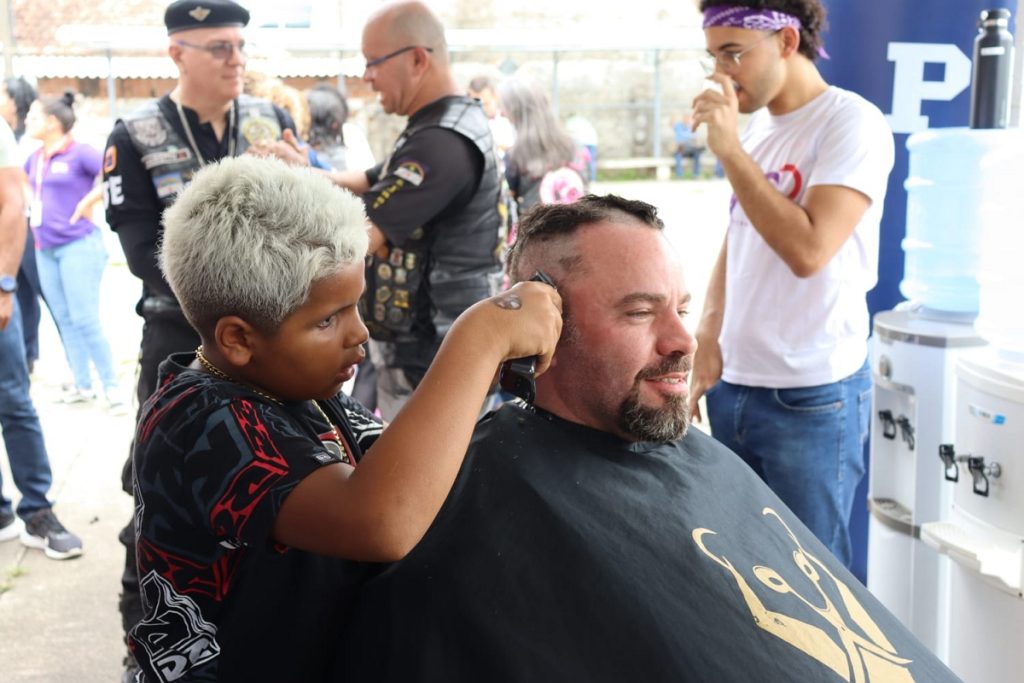 Os policiais também rasparam o cabelo com a ajuda das crianças, como um gesto de solidariedade aos pacientes. A ação aconteceu em alusão ao Dia Nacional de Combate ao Câncer Infantil, lembrado na data de 23 de novembro.