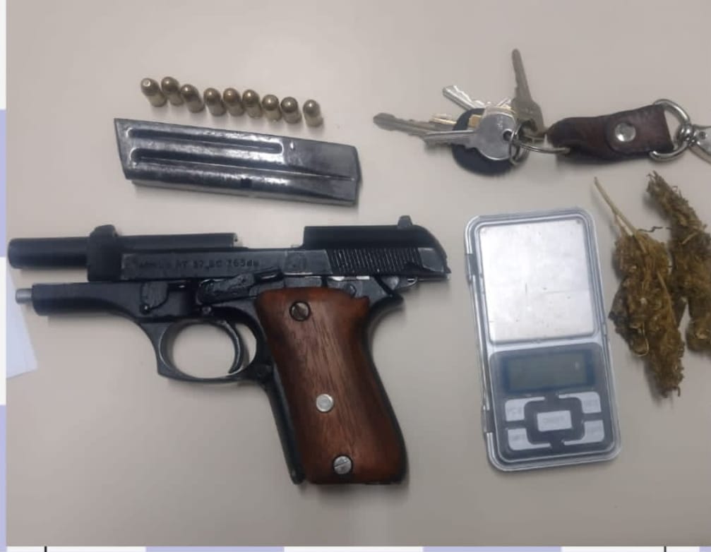 Na casa da vítima que tinha passagens, a polícia apreendeu uma pistola, maconha e uma balança de precisão.