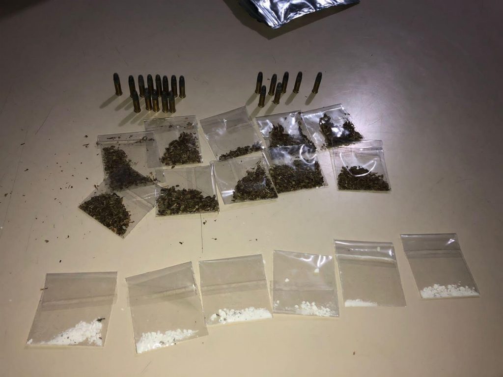 Na sequência, ao refazerem o trajeto percorrido pelos suspeitos, os policiais localizaram um saco preto abandonado próximo a uma lombada. Dentro dele, foram encontrados maconha, cocaína e um pacote contendo 20 munições de calibre 22.