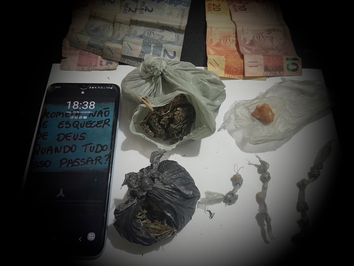 Durante a revista, foram apreendidos 12 pedras de crack, uma pedra maior pesando aproximadamente 4 gramas, além de 38 gramas de maconha. Também foram encontrados um aparelho celular e uma quantia em dinheiro, o que, segundo a PM, reforça a prática do comércio ilegal de drogas.