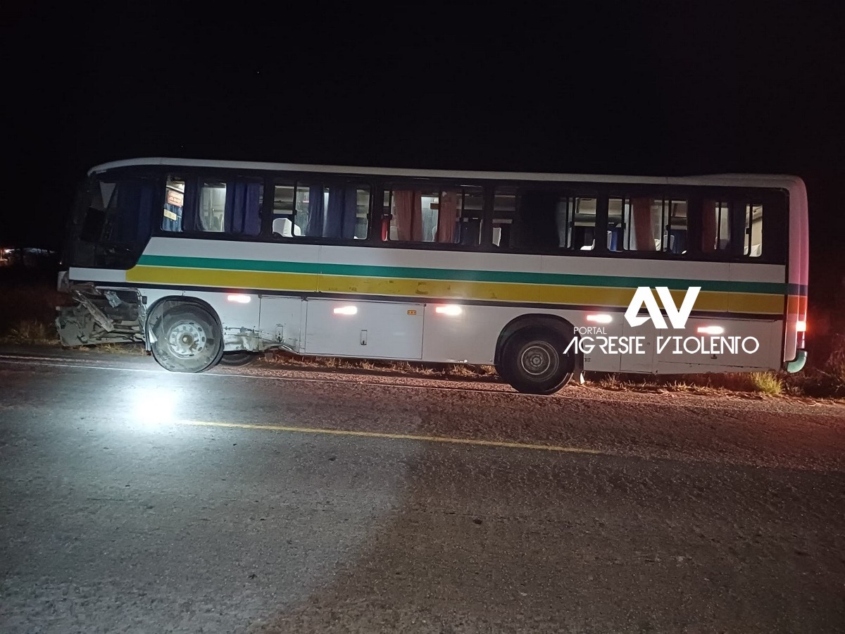 Um acidente envolvendo um ônibus e um carro deixou o motorista do veículo de passeio ferido na tarde deste sábado (30), no quilômetro 71 da BR-423, em Jupi, Agreste de Pernambuco. A colisão aconteceu por volta das 18h e, segundo informações da Polícia Rodoviária Federal (PRF), há indícios de que o carro teria invadido a contramão da rodovia, provocando o impacto.