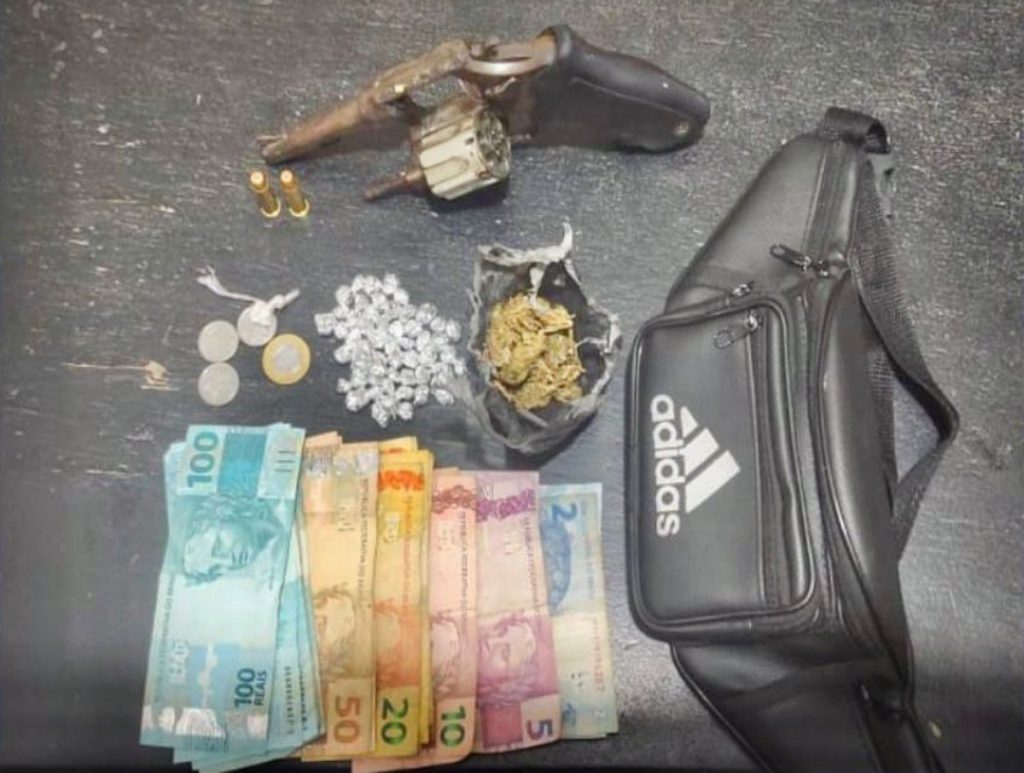 Com os suspeitos, os policiais encontraram 56 pedras de crack, 11 gramas de maconha, um invólucro de cocaína, um revólver calibre 38, duas munições, além de R$ 958,00 em espécie e uma pochete utilizada para armazenar os materiais ilícitos.