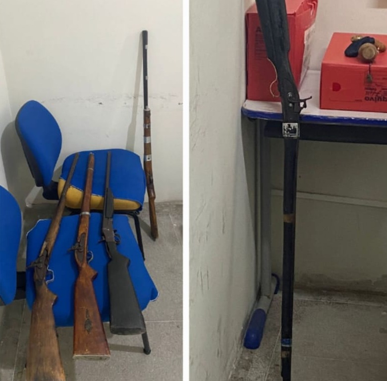 Durante a ação, que teve como objetivo localizar bens e materiais ilícitos, as equipes policiais encontraram cinco espingardas em um dos endereços investigados. O proprietário do imóvel afirmou que as armas pertenciam a seu pai, que se apresentou no local e assumiu a posse.