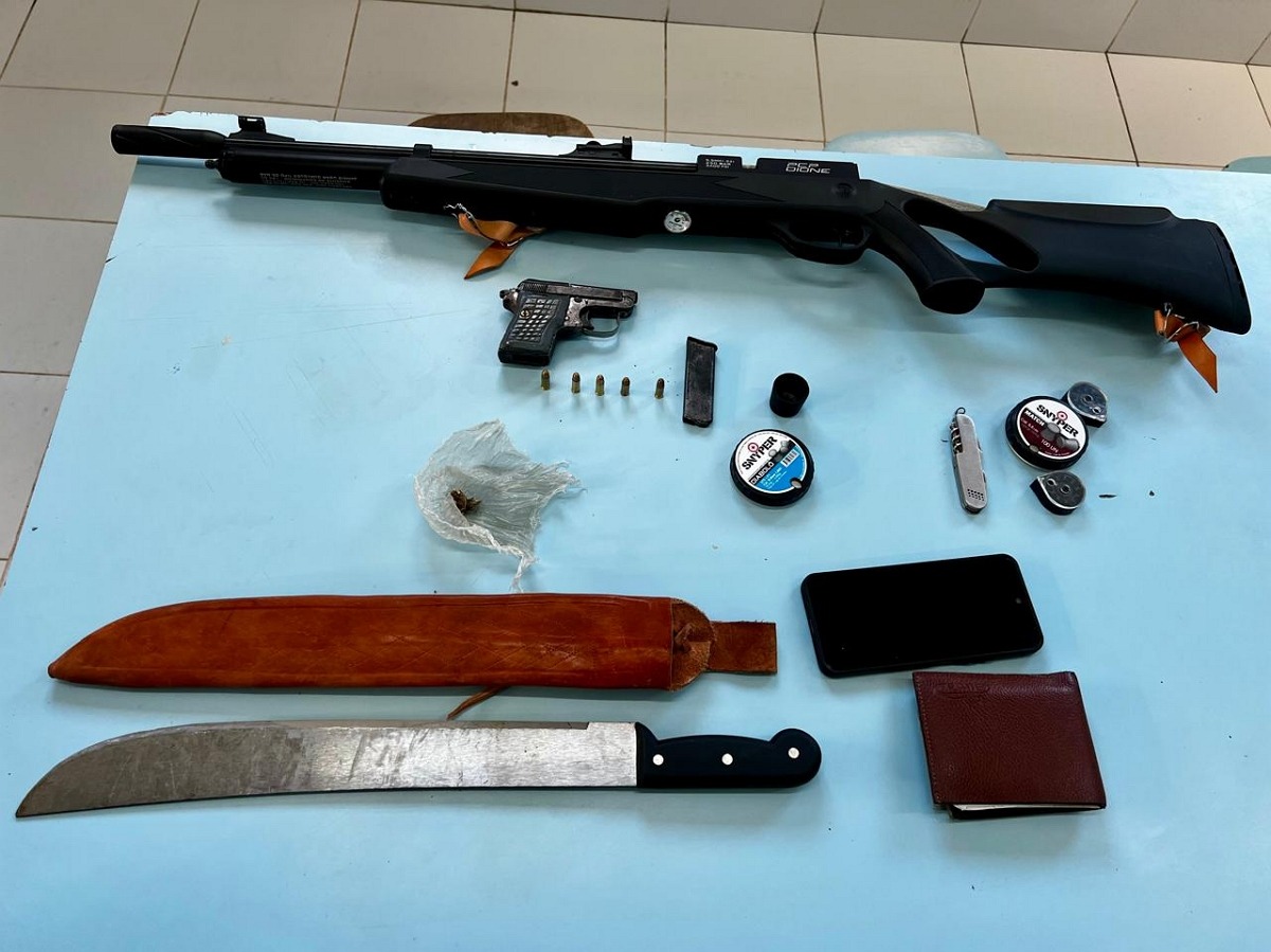 Na revista pessoal, os militares encontraram com o piloto da motocicleta uma porção de maconha. Além disso, dentro de uma mochila, foram apreendidas uma espingarda de pressão e uma pistola calibre 6.35, carregada com cinco munições. O passageiro afirmou que o material ilícito pertencia ao condutor.
