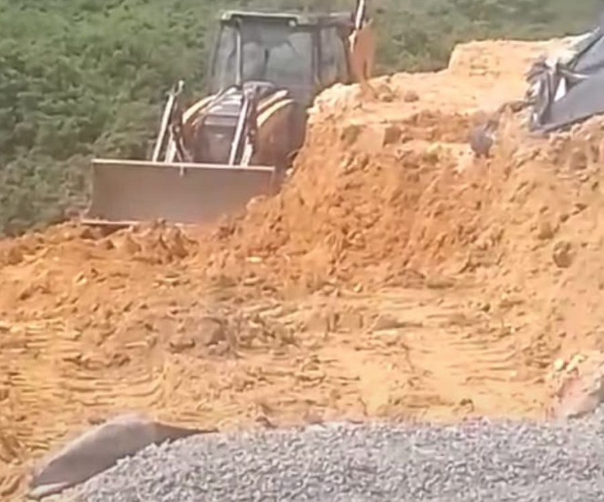 No local, foi presenciado o funcionamento de uma obra, com movimentação do solo em uma área de vegetação já suprimida. Um homem que estava operando uma retroescavadeira se apresentou como responsável pela ação.