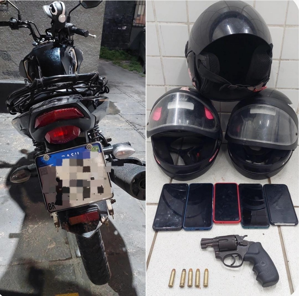 No local, o suspeito estava deitando a moto no chão e tentou fugir, mas caiu e foi capturado. Além do veículo, foram apreendidos com ele um revólver calibre .38 com cinco munições e cinco celulares.